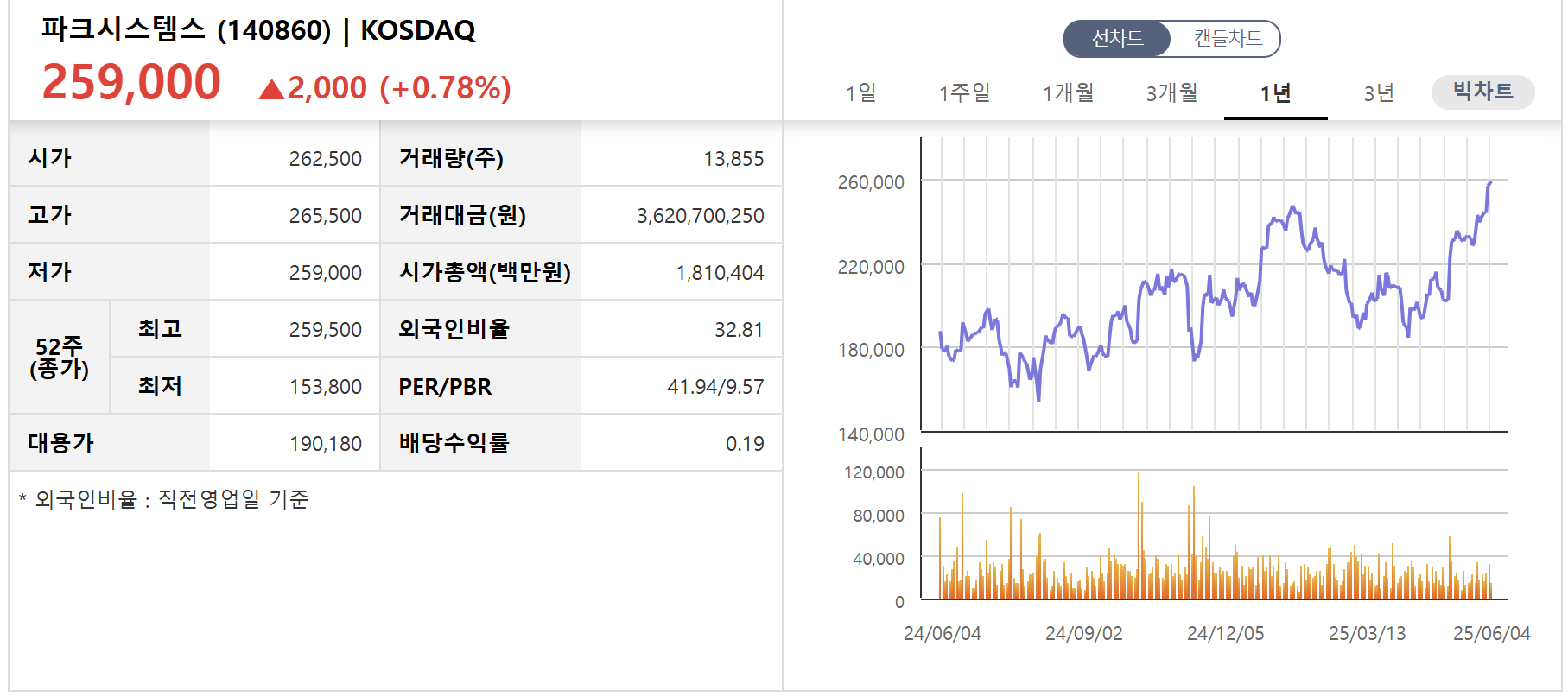 | 파크시스템스 | 약 5,000억 원 | 24.6 | 41.9 | 9.44 |
