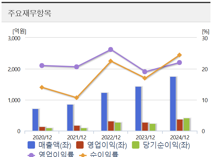 2024년 기준, 파크시스템스는 1,418억 원의 매출을 기록했으며, 영업이익은 329억 원, 순이익은 389억 원으로 전년 대비 각각 24%, 27%, 49%의 높은 성장률을 보였다. ROE는 약 24.6%로, 자본 효율성 측면에서도 탁월한 성과를 나타냈다.