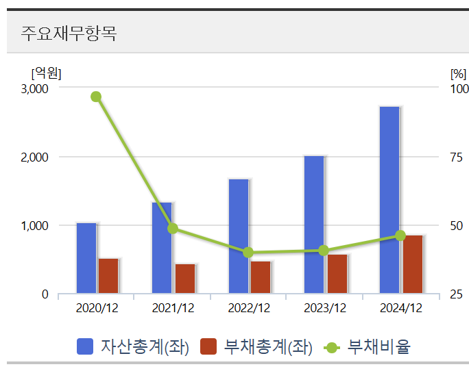 매출액, 영업이익, 당기순이익 모두 꾸준히 오름세고 자산 증가 대비 부채는 크게 늘어나지 않고 있어 부채 비율도 양호해 보임